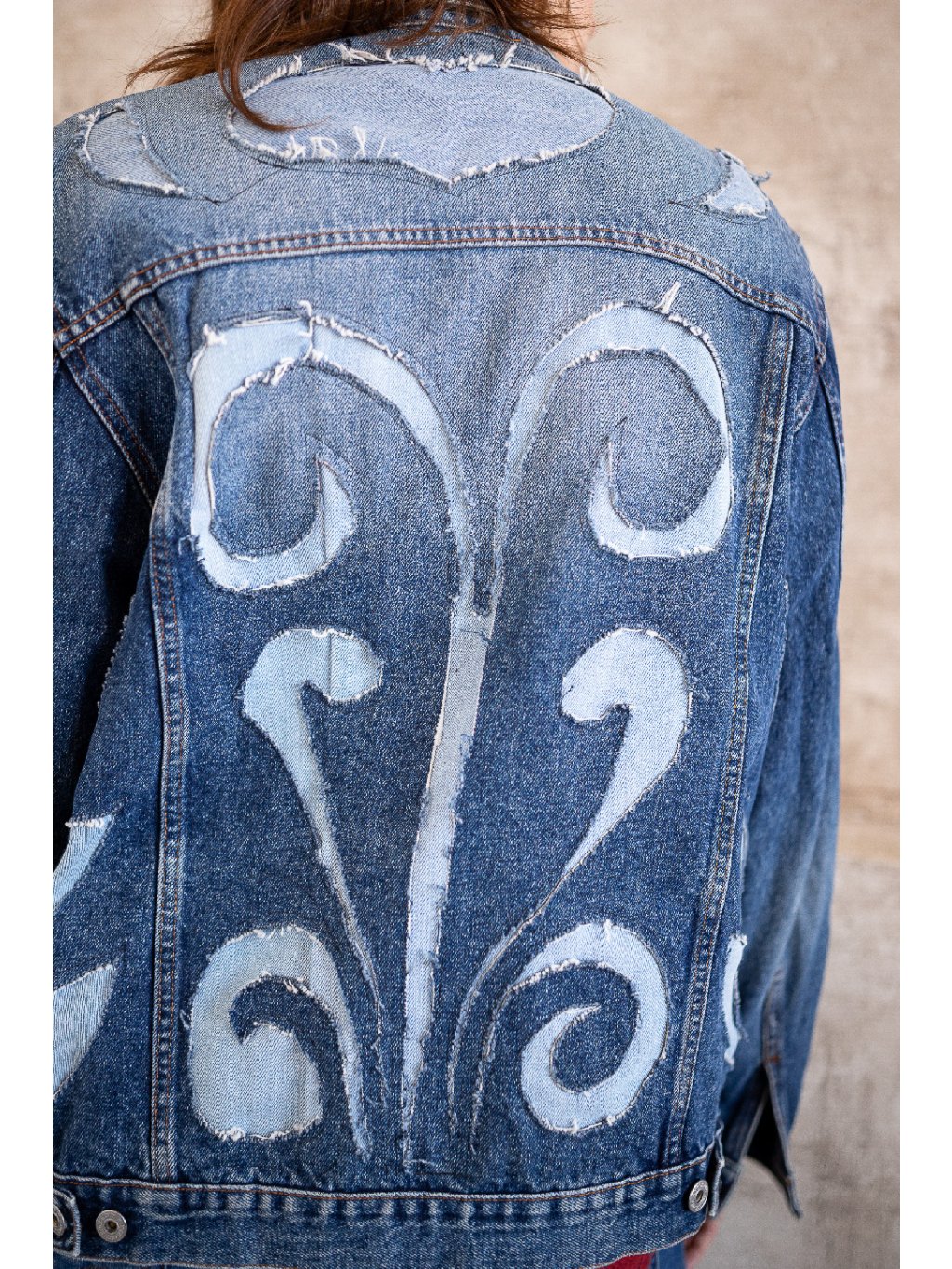 Upcyklovaná džíska velikosti L s prošívaným denimem ve folklorním vzoru.