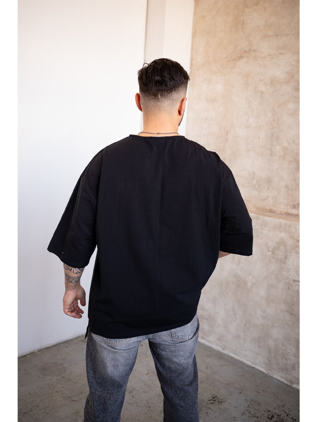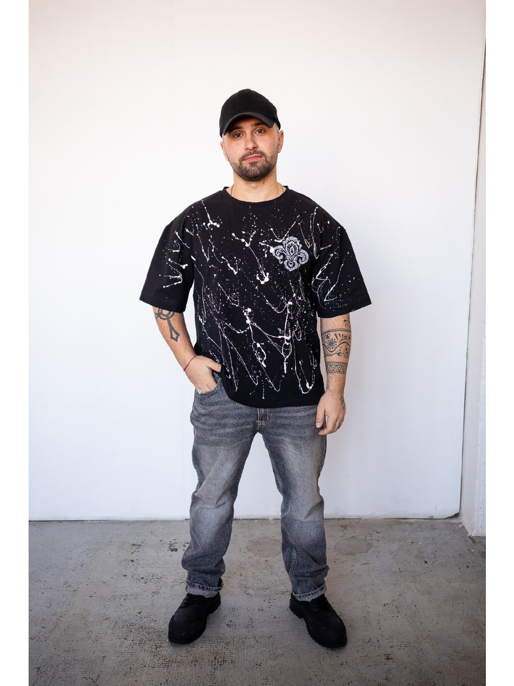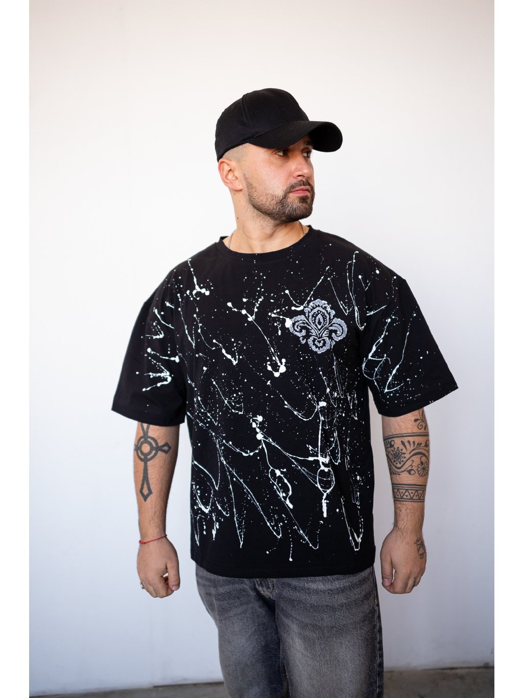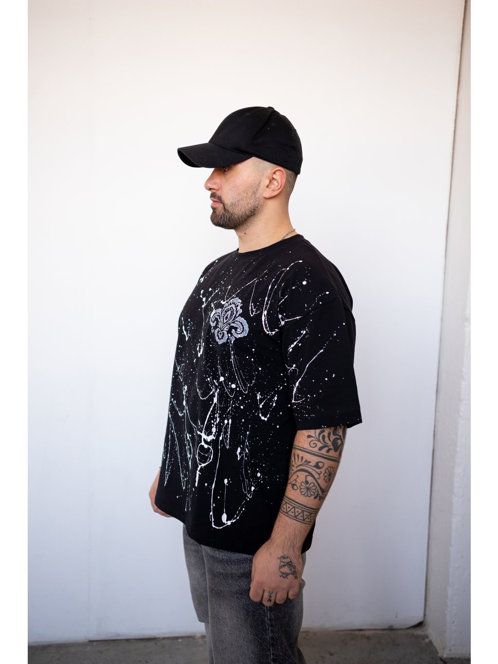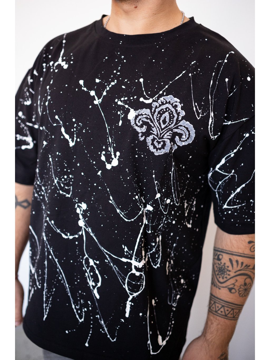 Unisex triko v oversize střihu s bílým postřikem a folklorním potiskem.