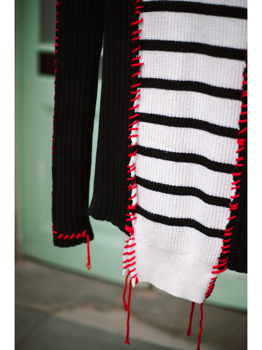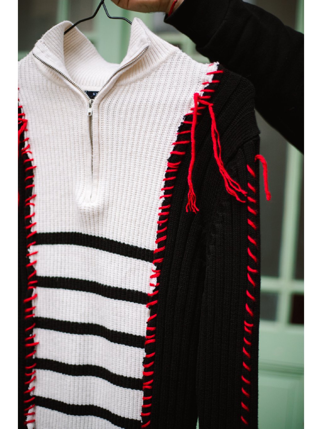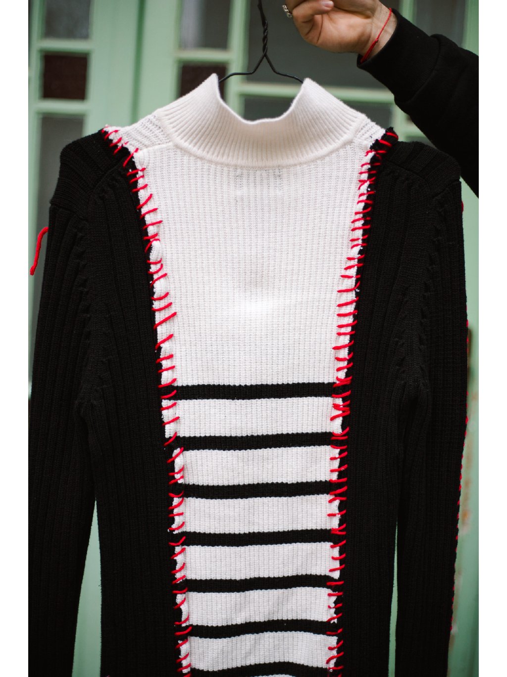 Nevšední upcyklovaný svetr je sešitý z několika kusů.