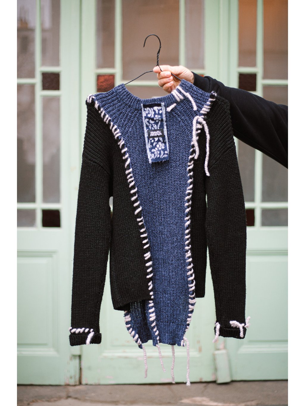 Nevšední upcyklovaný svetr je sešitý z několika kusů.
